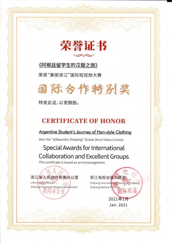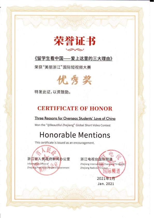 近日,在浙江省人民政府新闻办公室主办、浙江广电集团国际频道承办的“美丽浙江”国际短视频大赛中,我校国际交流与合作处组织选送的《留学生看中国——爱上这里的三大理由》《美丽浙江》两件作品获优秀奖,《选择浙江的五大理由》《阿根廷留学生的汉服之旅》两件作品获“国际合作特别奖”,《畲乡之窗》获“最佳剪辑奖”,学校还获优秀组织奖。