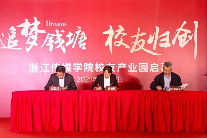 av動漫校友产业园依托我校戏剧与影视学、播音与主持艺术、影视摄影与制作、广播电视编导等学科专业优势和雄厚的校友资源,为校友回归钱塘区创新创业提供从孵化、加速到产业化的平台,园区重点聚焦影视制作、文化创意、工业设计、数字新媒体、短视频直播、网红孵化等新兴行业,力争打造成全国知名的数字传媒产业园。