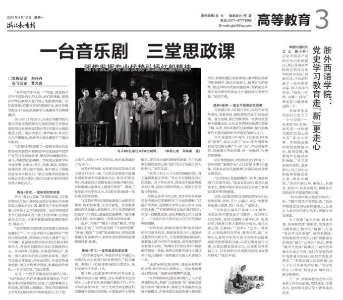 4月12日,《浙江教育报》刊登《一台音乐剧 三堂思政课》通讯稿,从“舞台+思政”“排练+学习”“浸润+延伸”三个维度报道了我校思政课程教学“有法”、课程思政育人“有味”、思政文创传播“有力”,发挥专业优势推进党史学习教育走深走实走心。