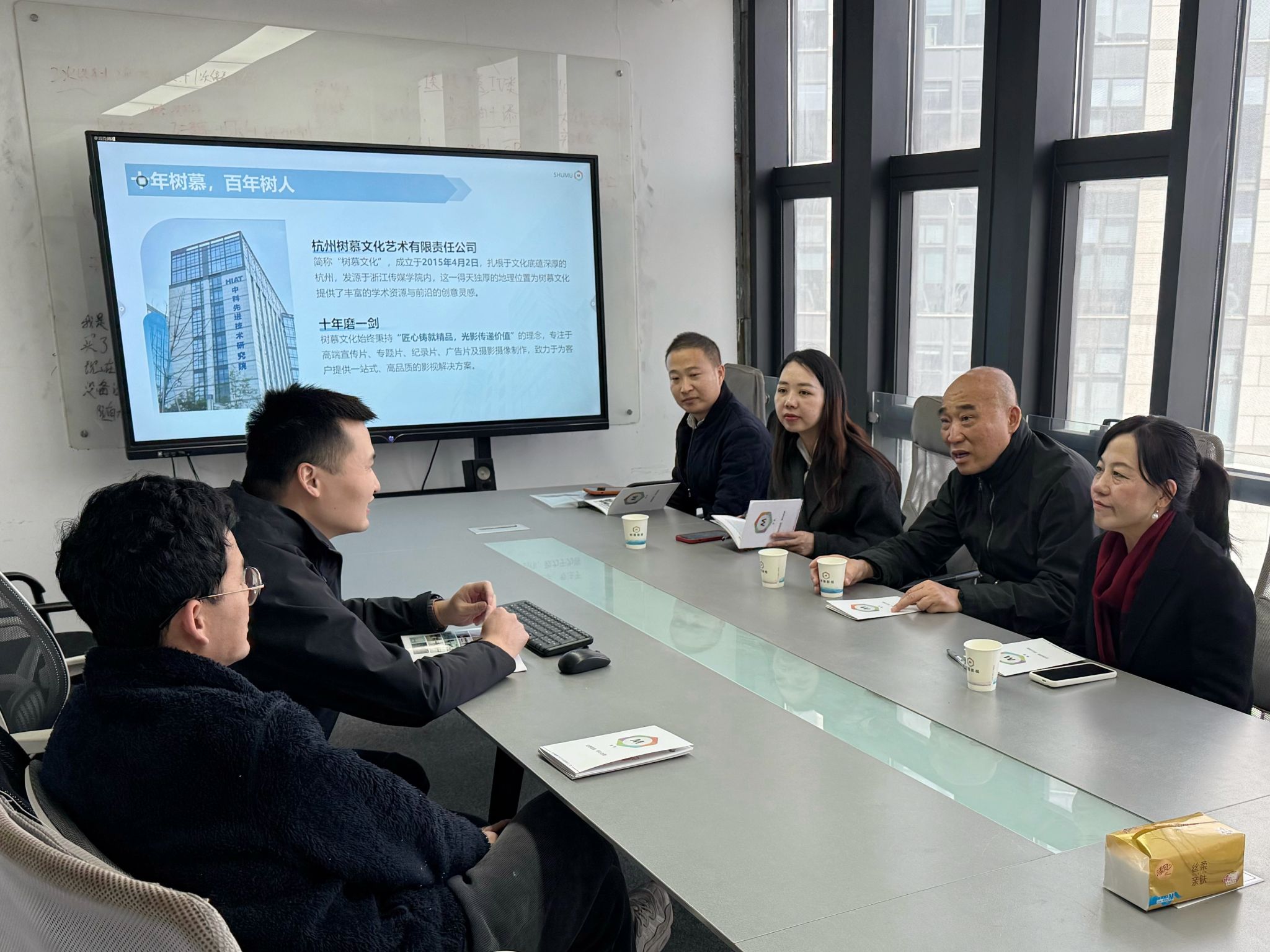 杭州树慕文化艺术有限责任公司由2011级广播电视工程专业校友张容创办,主营在线开放课程、宣传片、专题片及各类视频制作,业务网络遍布江浙沪乃至全国多地。在参观交流中,徐伟标一行深入了解公司的发展历程、业务现状、技术优势及未来发展规划,围绕学校创新创业教育、产业园平台建设、就业育人机制等议题与公司负责团队进行交流,鼓励他们要充分利用杭州的区域优势,关注文化“新三样”出海、高水平文化强省建设等政策导向,加强学习,做到“抬头看路”。