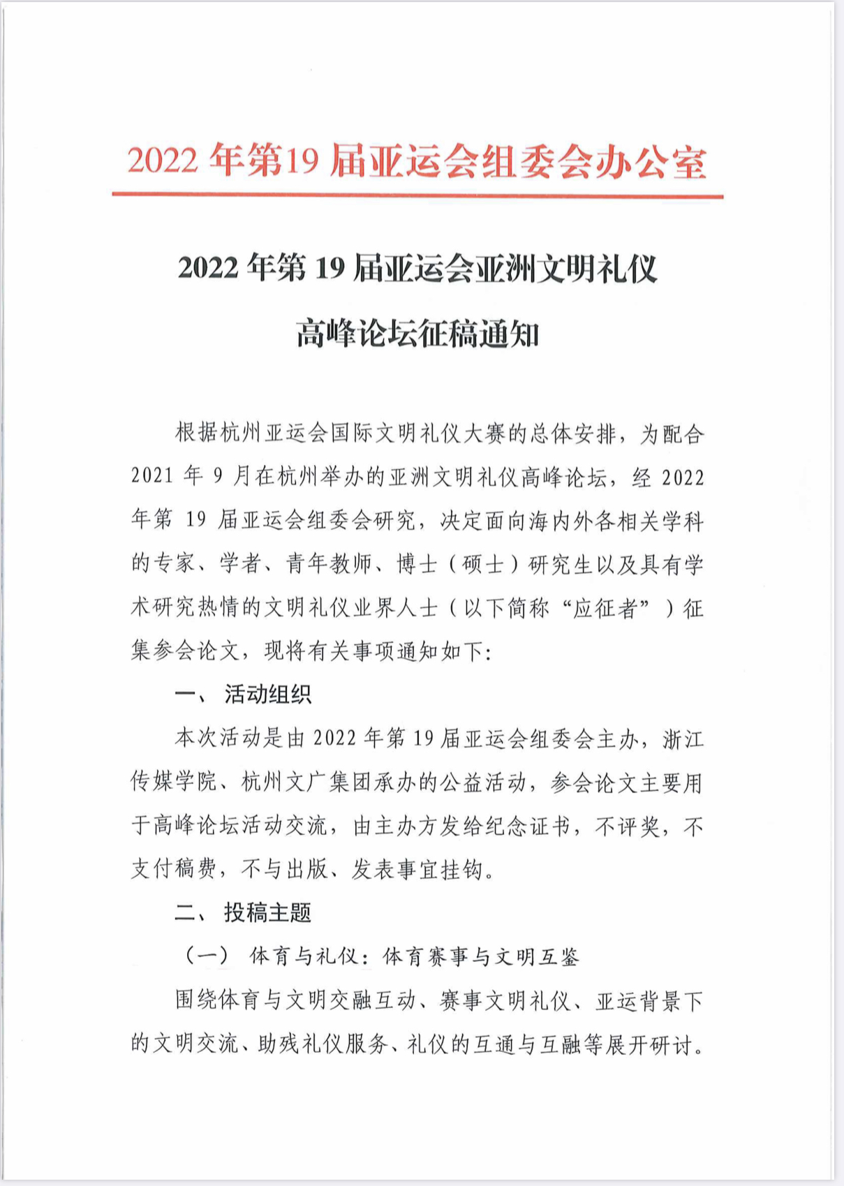 2022年第19届亚运会亚洲文明礼仪高峰论坛征稿通知