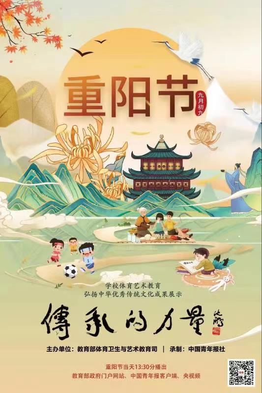由教育部主办的《传承的力量——学校体育艺术教育弘扬中华优秀传统文化成果展示活动》系列节目再度启程,于重阳时节走进校园,助推中华优秀传统文化发展创新。