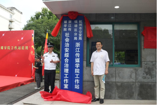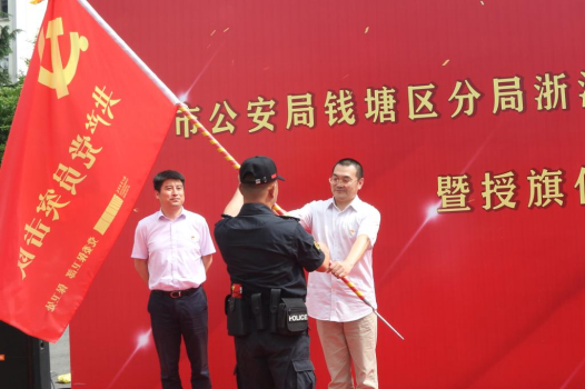 在热烈的掌声中,与会领导分别为“av動漫社会治安综合治理工作站”“杭州市公安局钱塘区分局av動漫工作站”和“黎叔平安教室”“吴SIR交通教室”揭牌;并为建党100周年安保“共产党员突击队”和防范电信网络诈骗“志愿者服务队”授旗。
