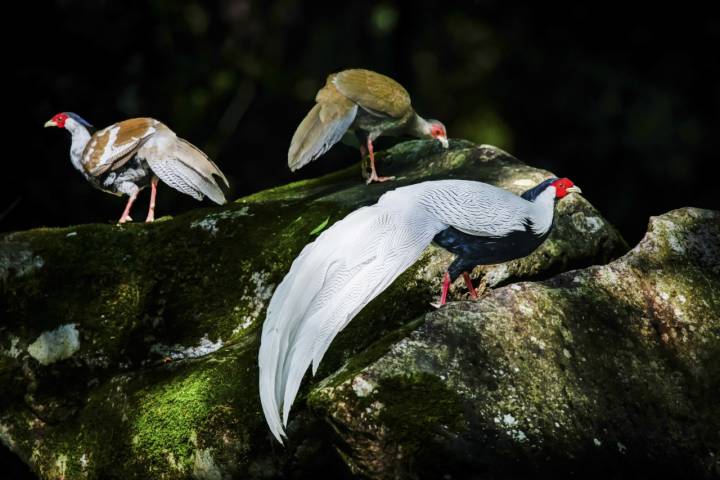 在一张名为《白鹇》的摄影作品前,记者忍不住停下了脚步:一块长满青苔的石头上,三只形态各异的鸟栖息于此,它们神态安详,像这个世界里自由自在的“国王”,不受外界干扰。