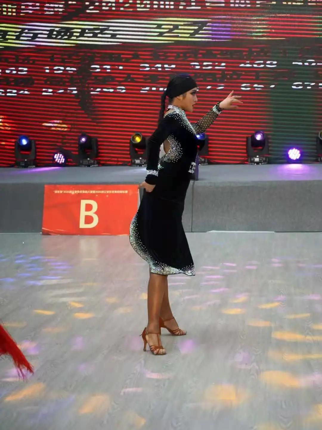 桂茹云稳住呼吸,脚下卯足劲,努力控制住自己的平衡,跟着恰恰的音乐,在舞池中摇曳,尽管有几次险些摔倒,但没有影响到整个人的竞赛状态。水钻在墨色舞裙的衬托下闪闪发光,最终流畅地完成了每一支舞。