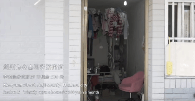 他去到李兰清一家人租住的房子,房间只有12平方米大小,月租金五百。狭窄、拥挤是厉梦阳的印象,所有的衣物和物品杂乱的堆在一起。虽然生活条件不好,住房也狭小简陋,但李兰清仍能感受到温暖。