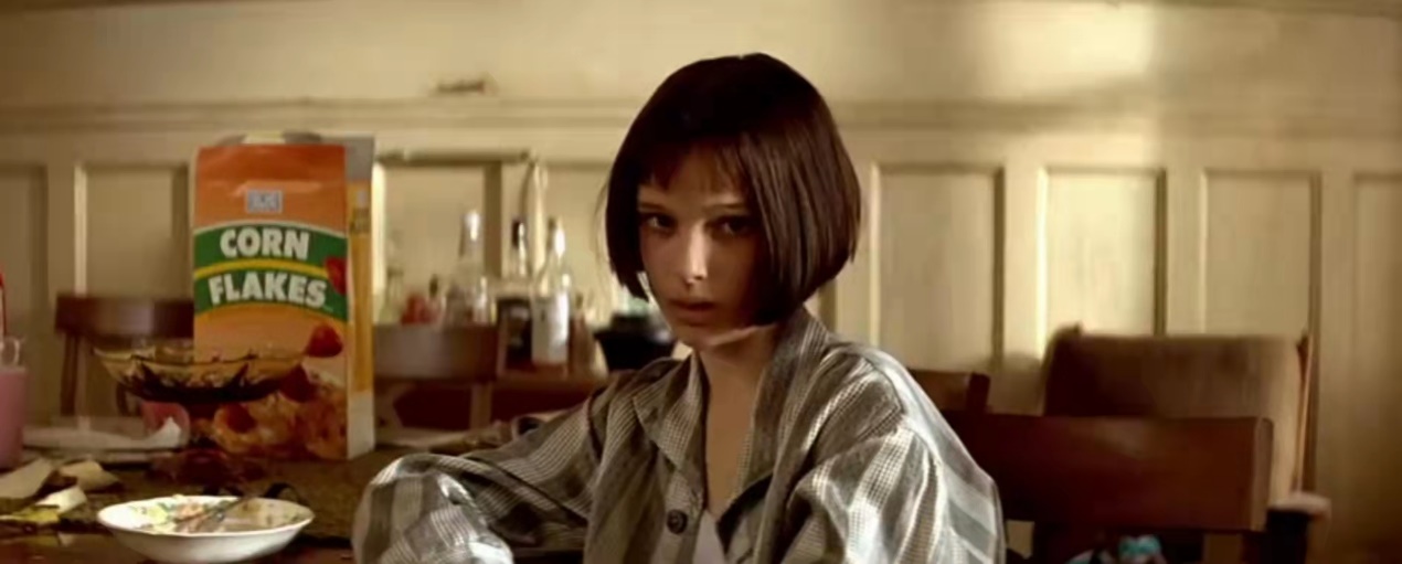 右手的食指和中指间熟练地夹着一根烟,白烟萦绕在指间。头没有生气地垂着,利落的短发盖住了半边脸。透过楼梯栏杆繁复的黑色花纹,小女孩抬起头抽了一口烟,眼神有些淡漠。彼时里昂照常杀完人,照常买了两罐牛奶,一个人走过长长的楼梯回家,遇到了坐在楼梯口的玛婷达。有人来了,玛婷达把烟藏起来,眼神瞬间变得桀骜。她上下来回打量着里昂,看起来不羁又不屑。