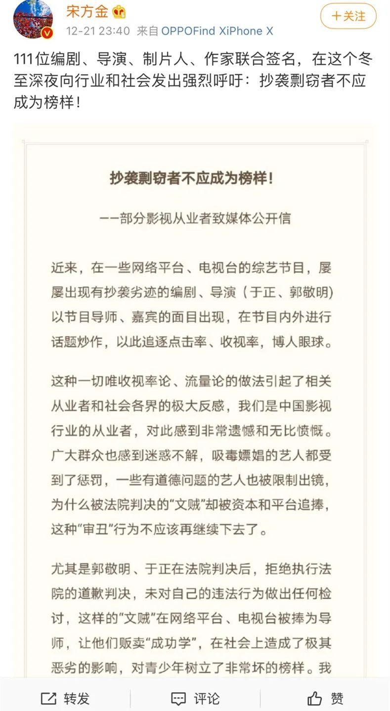 2020年12月21日深夜,以余飞、宋方金为代表的111名导演、制片人、编剧等影视从业者通过微博发布了一张联名的致媒体公开信《抄袭剽窃者不应成为榜样》,呼吁抵制此前已被法院判决剽窃他人作品的于正和郭敬明。