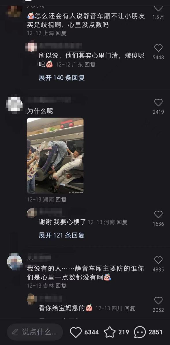 以高铁为例,近年来,因孩子哭闹而投诉的案例屡见不鲜。高铁部门曾尝试通过乘务员干预来解决这一问题,但这种方式似乎并未平息年轻人的不满。于是,在20年年末试点并在23年推广后,静音车厢应运而生。然而,这一举措又引发了有孩群体的抗议,他们认为同等的票价却有不同的待遇,这是对弱势群体的不公平。