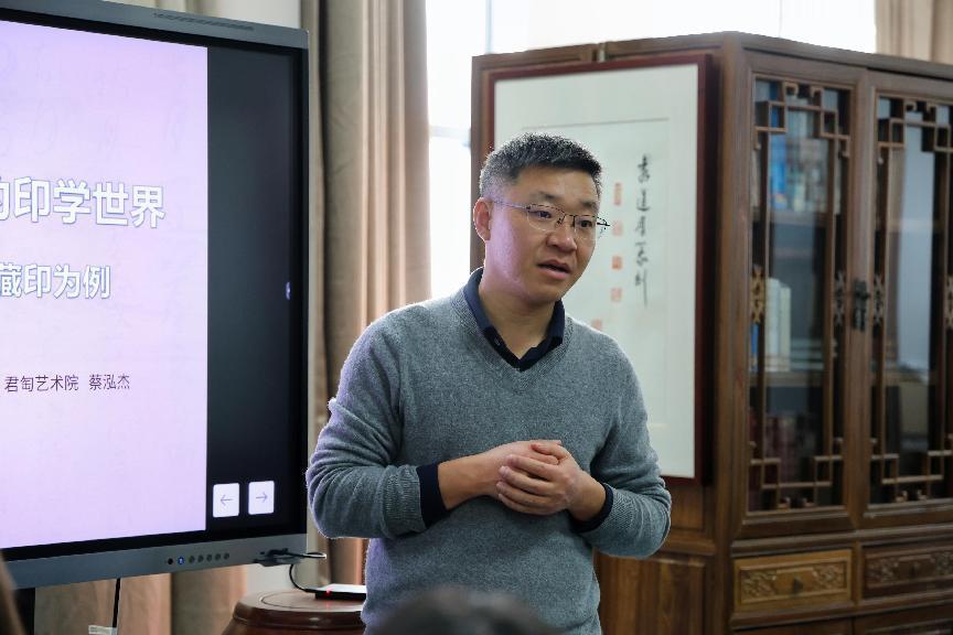 他总结到这三大家的印学具备“印宗秦汉、印合两宗、印从书出、印外求印”这四个特色。元代吾衍、赵孟頫目睹宋元印风凋敝、日渐衰败,有感而发提出了“印宗秦汉”的艺术主张,自此便一直被篆刻界奉为圭臬;篆刻发展到清初,由于篆刻刀法的不同,逐渐发展出了使用切刀的浙派和使用冲刀的皖派,其为“两宗”;“印从书出”则讲究书印一体,提倡篆刻表现书风。蔡泓杰也通过展示大量的印章图片直观地向同学们解释“印外求印”这一特点。