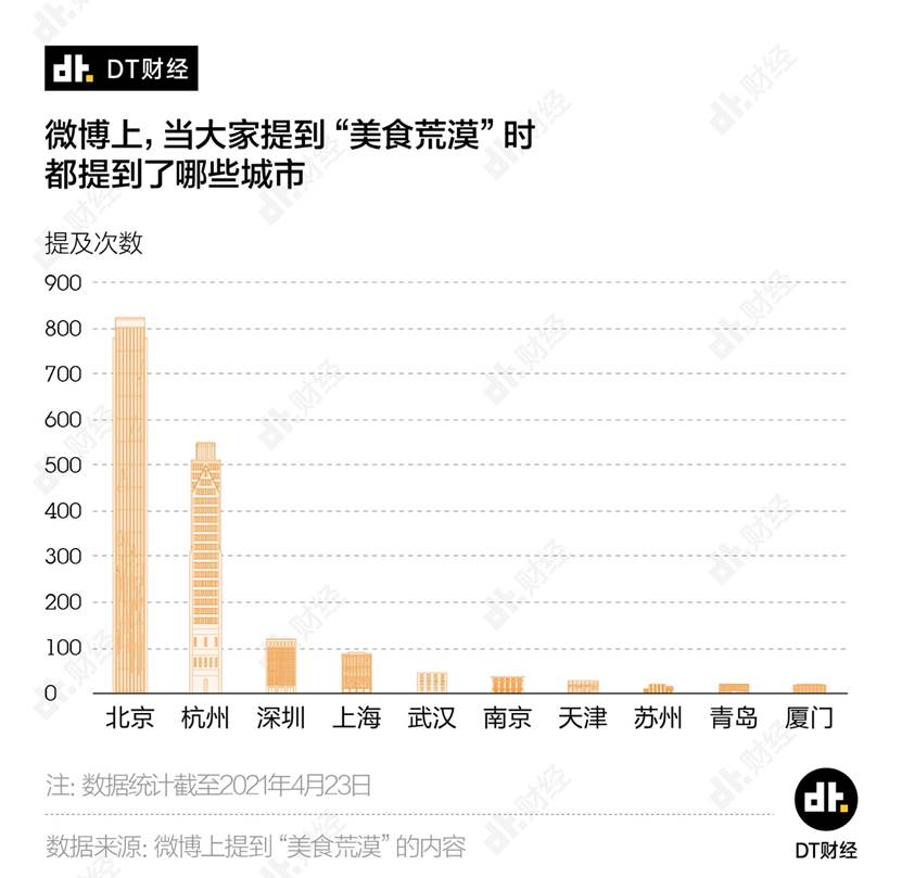 近年来,“美食荒漠”这个词在人们的视野中出现的频率越来越高。从第一财经旗下的数据研究型青年媒体DT财经对于“城市与美食荒漠”的研究报告来看,我们发现北京、杭州、上海这种千万人以上的大城市,在“美食荒漠”称号被提及榜上遥遥领先。这些大城市缘何成为美食荒漠,而人们对美食荒漠的评判标准又是什么,值得一番深思。