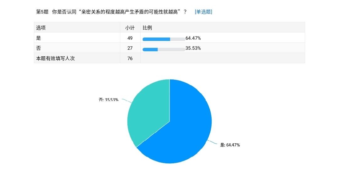 其实不只是亲密关系,只要是关系,有互动就可能带来压力。经调查发现,76份有效问卷中,64.47%的人认同“亲密关系的程度越高产生矛盾的可能性就越高”和“伤害亲密的人成本更低”这两种观点。英国学者Richardson将这种伤害亲密的人的现象称为“日常性攻击”。攻击的产生会反映出人们的关系中更深层次的问题——距离与权力。在任何一段亲密的关系中,无论是父母与子女之间,还是爱人之间,距离和权力都是关系中非常核心的因素,它们表现出人与人之间关系的平等性,以及谁是主导和控制的一方。