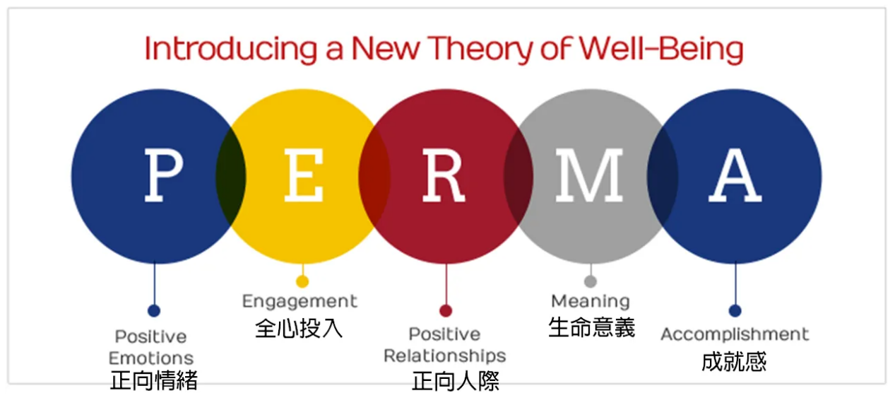 PERMA理论由“积极心理学之父”马丁·塞利格曼(Martin Seligman)在《持续的幸福》一书中提出。PERMA指的是创造充实、快乐和有意义的生活所必需的五大元素,它们包括Positive emotion (积极情绪)、Engagement(投入)、Relationship(人际关系)、Meaning(意义)、Accomplishment(成就)。