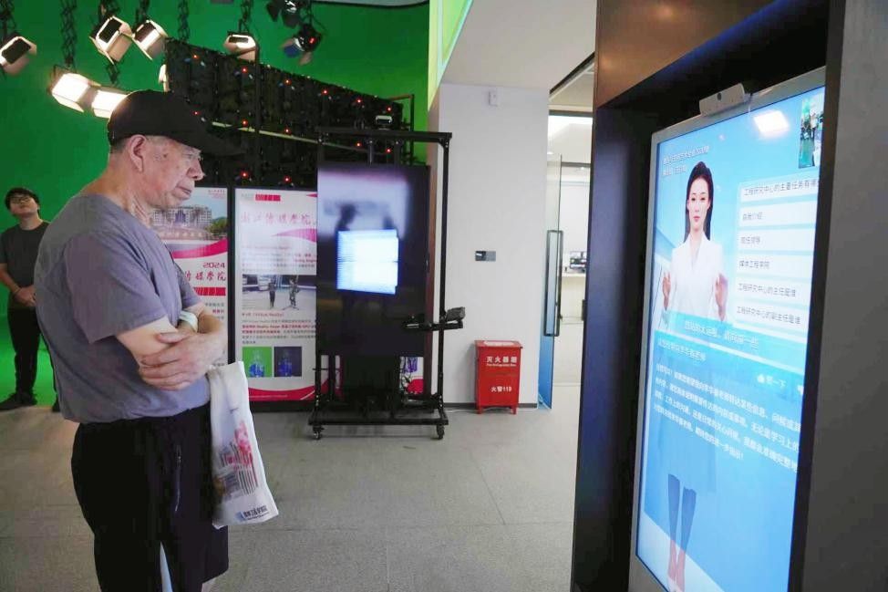 “你好,明天是什么天气?” 面对虚拟主播,浙江老年大学的学员主动提问,虚拟主播流畅自然地回答、生动形象的表情,让大家感受到AI 技术的“智慧温度”。学院学生自主设计的“AIGC 校园相机”成了“爆款”体验项目——只需站在相机前拍摄2秒,AI就能快速生成带有校园特色场景的创意图像,老年学员们拿着生成的照片,开心地互相展示:“没想到现在 AI 还能帮我们‘定制’校园风景照,太有意思了!”