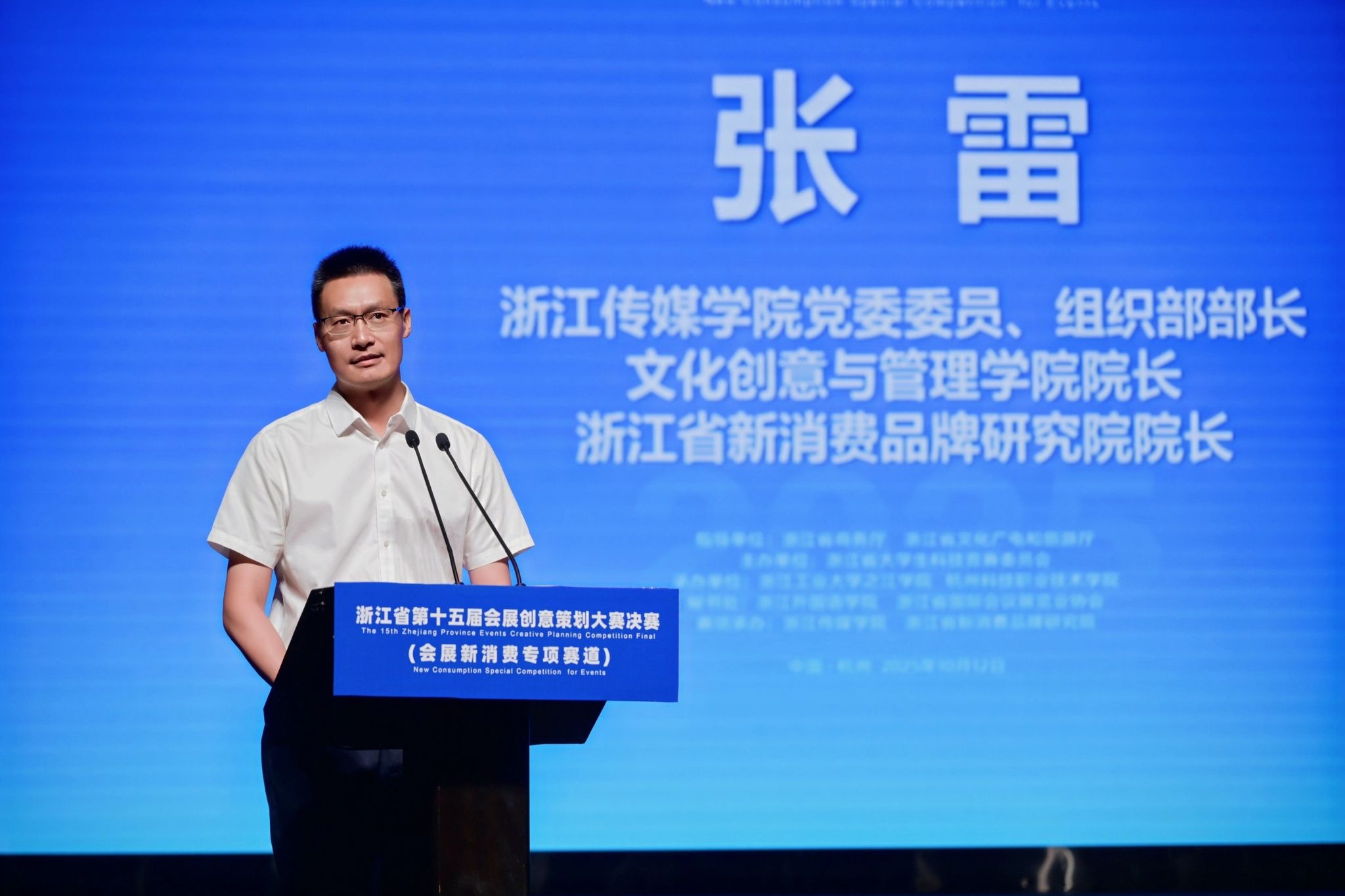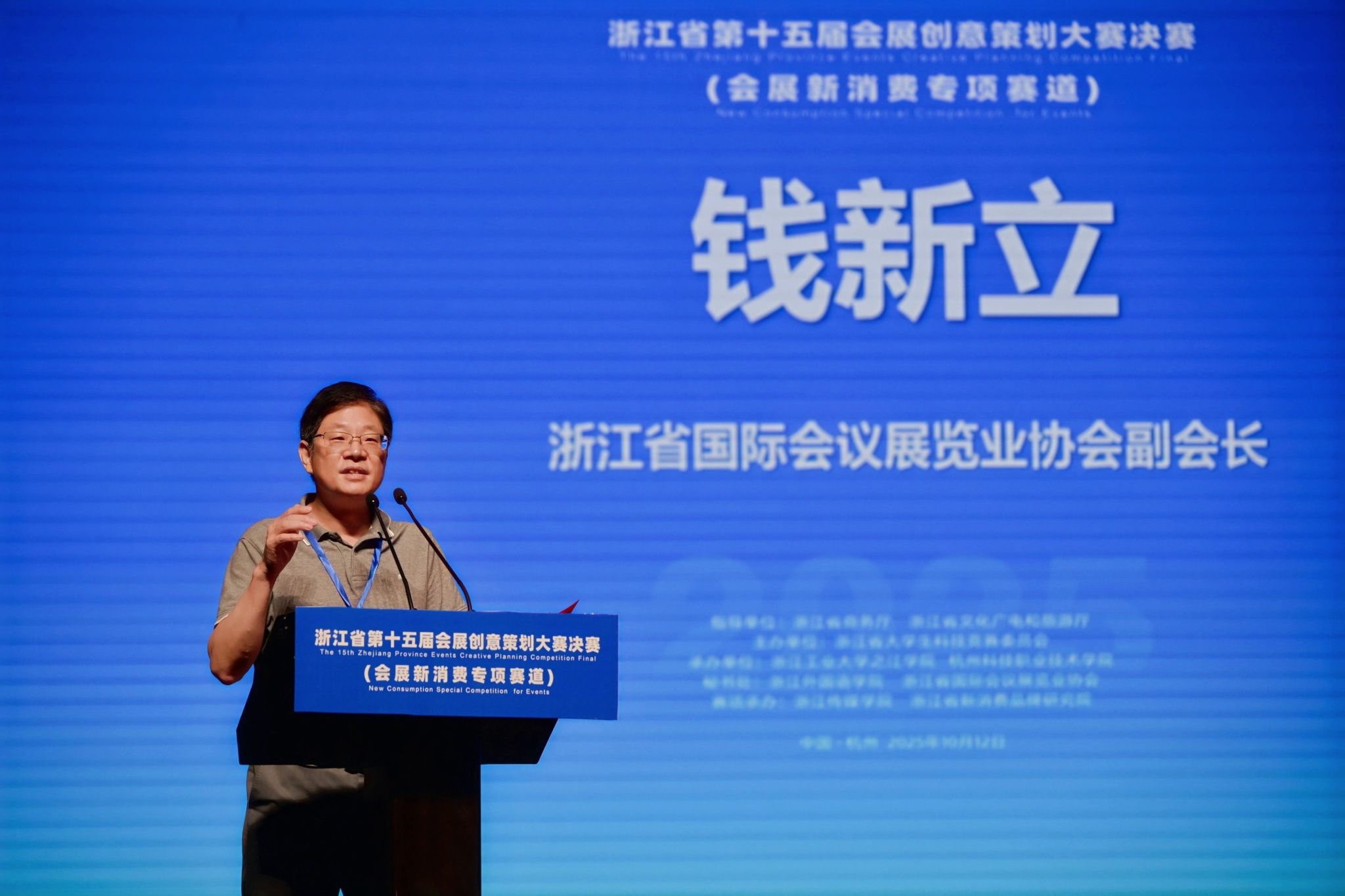 大赛秘书处代表、浙江省国际会议展览业协会副会长钱新立在致辞中回顾了大赛十五届不平凡的历程。他表示,大赛始终秉持“以赛促教、以赛促学、以赛促创、以赛促产”的宗旨,已构建起一个集“协同化、数字化、国际化、开放性”于一体的高素质会展人才培养平台。他特别指出,本届大赛首次设立的“会展新消费专项赛”具有深刻的时代意义,并寄语青年学子:“你们今天站在这个决赛舞台上,代表的不仅是个人和团队,更是浙江高校会展教育的最高水平,是推动行业未来发展的新生力量。”