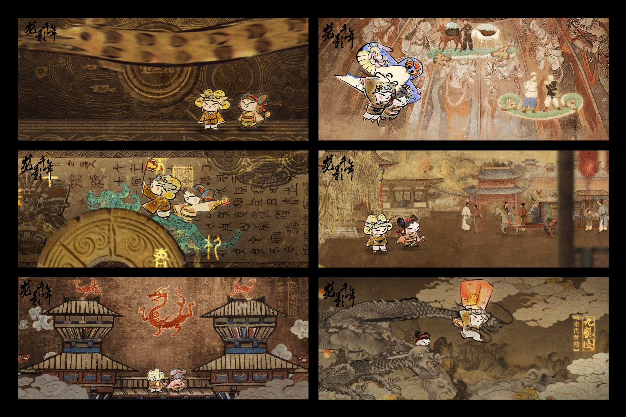 良渚文化方面,在影片巧妙的嵌入了良渚玉琮、良渚玉鸟、兽面纹等具有代表性的良渚元素,为影片增光添彩。新疆文化方面,将龟兹壁画、西域商旅、丝绸之路等也做了巧妙融合,尤其是龟兹壁画里的“生肖龙”,流失在海外德国柏林文化博物馆,通过艺术作品让文物“回国”。大系和典藏馆元素方面,将“盛世修典”融入影片文字章节,以汉文字的角度传播盛世文化,影片最后以《大音希声 •龙影千年“中国历代绘画大系”项目实施二十周年》为题,再次强调大系成果,画龙点睛。