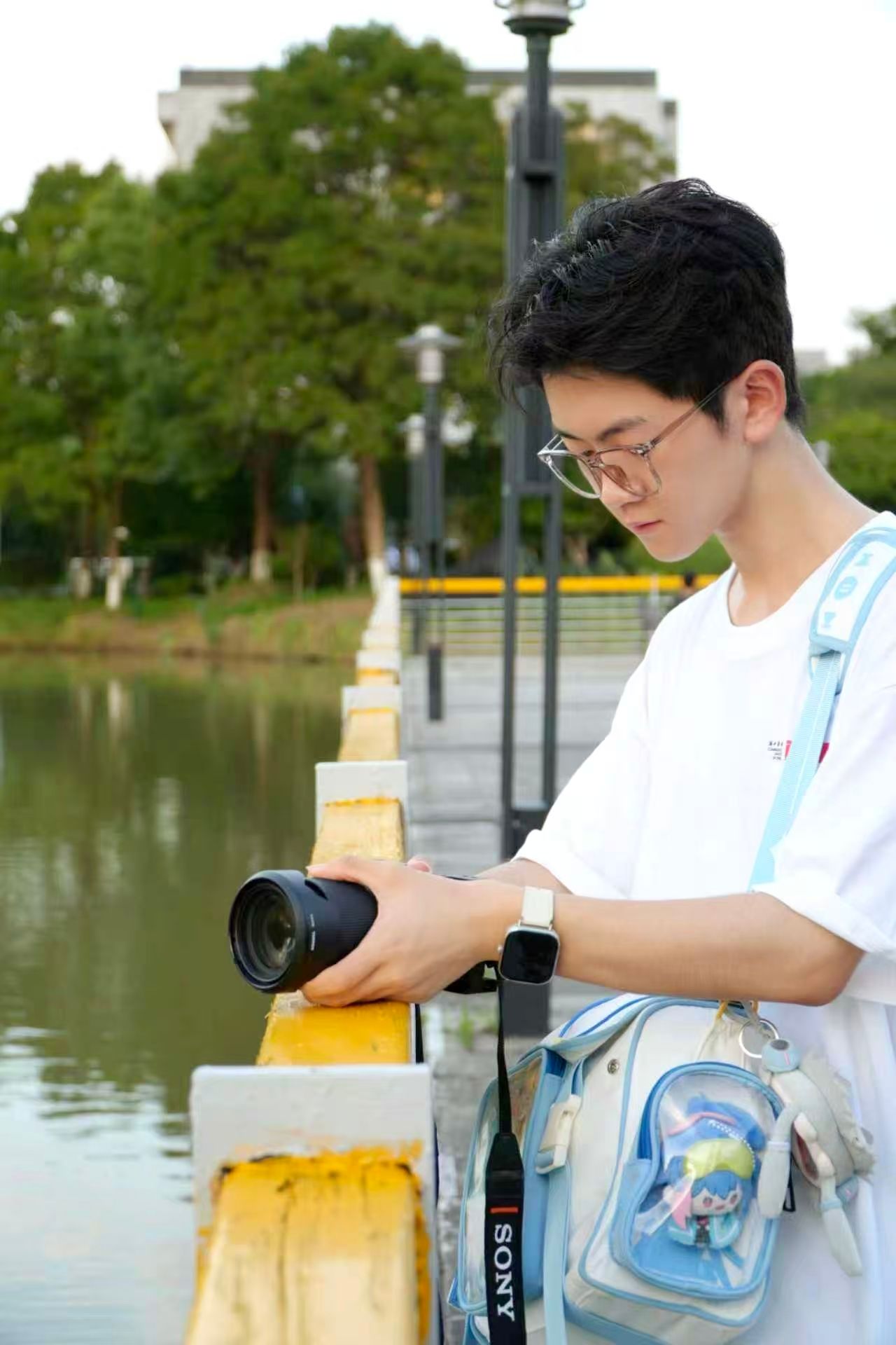 当广播电视编导专业的郭皓然向我展示他镜头下我的照片时,我看到的不仅仅是我在像素点的拼凑下呈现的我的妆容长相,还有他作为摄影爱好者的角度创意与构图巧思。通过相机,他捕捉到动态中的静止的一瞬间,手中黑色摄影器械的取景框内定格着彩色的世界,他干净简单的打扮下蕴藏的丰富情思和活跃灵感,私底下,他喜欢二次元文化,喜欢社交与分享,用轻松的语调鼓励他镜头下的每一个模特,也用开朗的个性感染着和他认识的每一个朋友。他的照片传达出模特和摄影师共同呈现的情绪,记录着瞬息变化的现实生活中一刻滞留的美好。