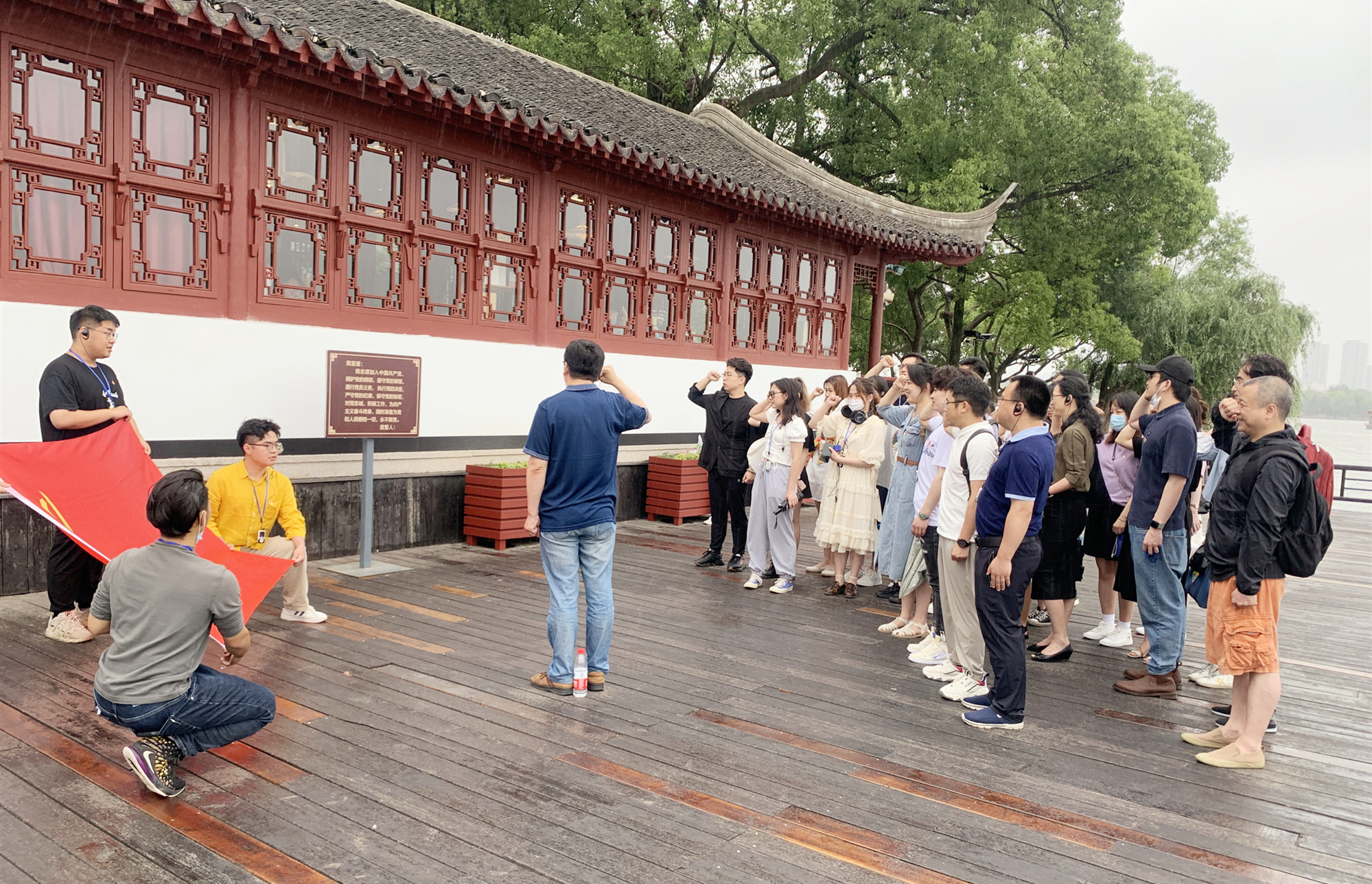 来到南湖宣誓台前,全体师生党员淋着雨面对鲜艳的党旗庄严宣誓,重温入党誓词。耳畔仿佛响起了隆隆的炮声,滴血的呐喊;眼前似乎又涌现出一代又一代人前赴后继,用纯洁的灵魂、热切的期望,在枪林弹雨中抒写共和国的壮丽诗章。