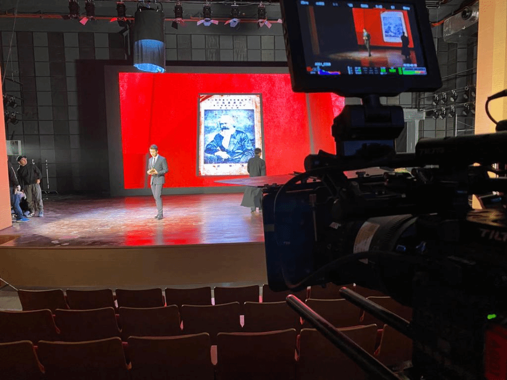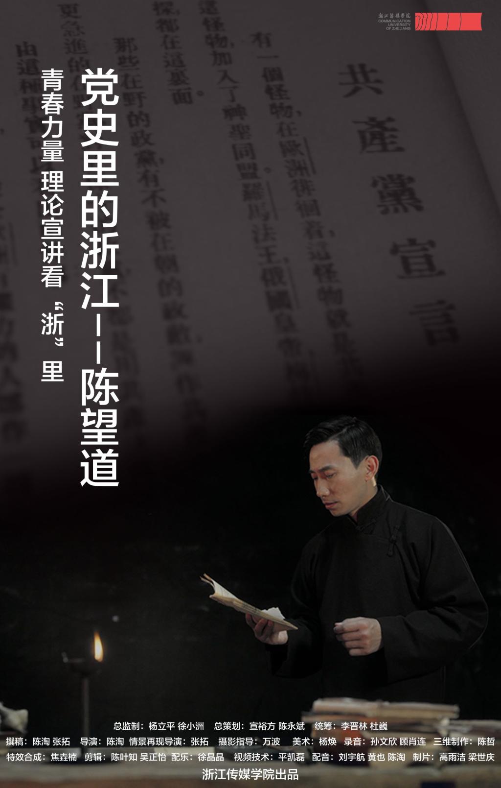 《党史里的浙江——陈望道》以舞台宣讲结合情景再现、以现场表演结合CG影像的方式,再现百年前陈望道先生翻译《共产党宣言》的情景。