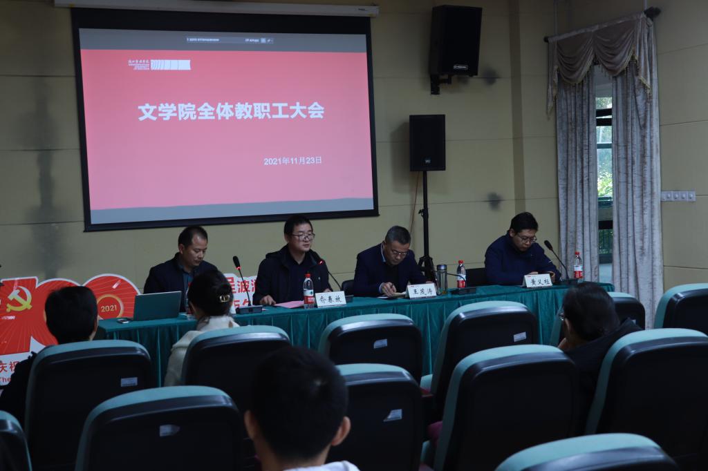 11月23日下午,文学院全体教职工大会在学院101室召开,学院特别邀请马克思主义学院丁友文副教授进行学习党的十九届六中全会精神专题宣讲。会议由学院党委书记王茂涛主持。