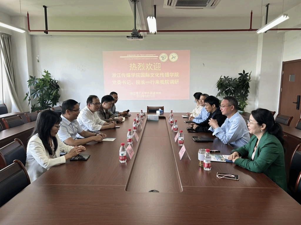 为进一步推进学习贯彻习近平新时代中国特色社会主义思想主题教育走深走实,扎实开展调查研究工作,近日,由国际文化传播学院党委书记黄鸣刚、院长戴运财率队赴浙江理工大学外国语学院考察调研。浙江理工大学外国语学院党委书记张祖品、院长文炳、副院长王昌米、副院长饶萍、党委副书记夏青出席座谈会。双方围绕各自学院建设和发展整体情况进行了交流,重点就党建与专业建设深度融合、科研团队建设与运行等方面进行深入探讨。
