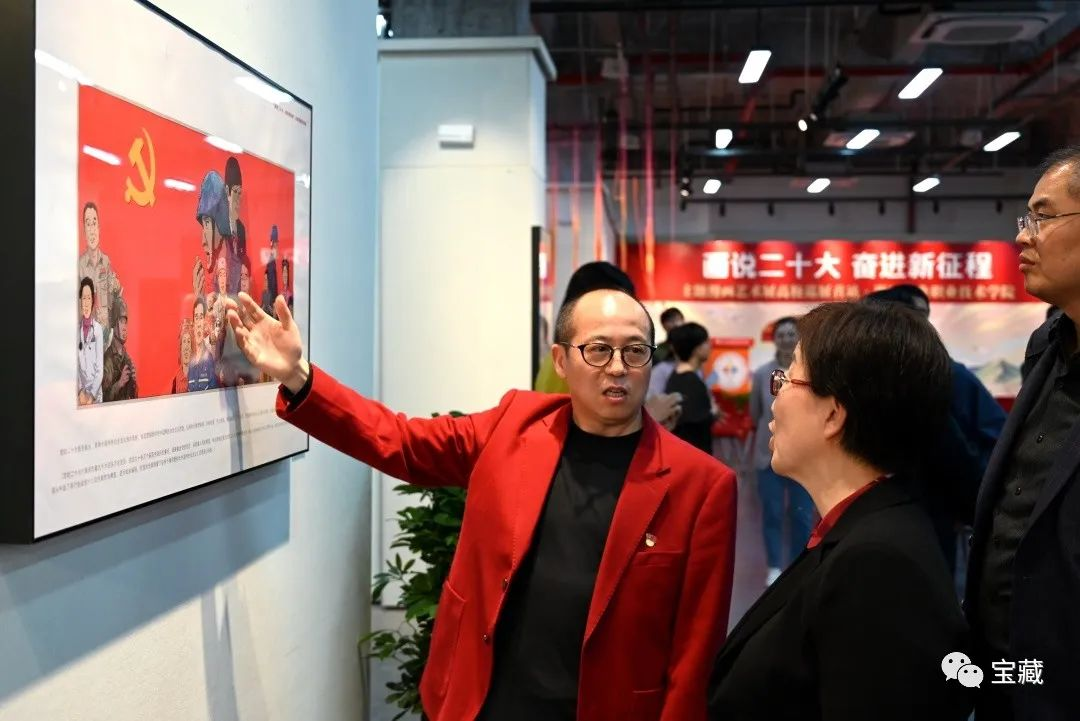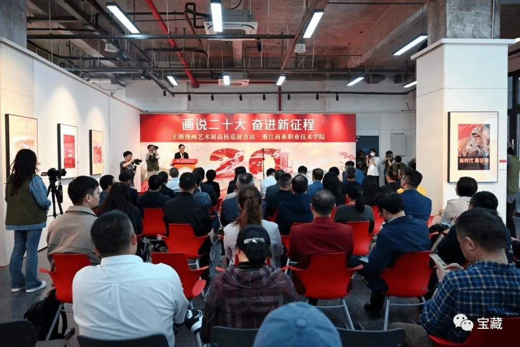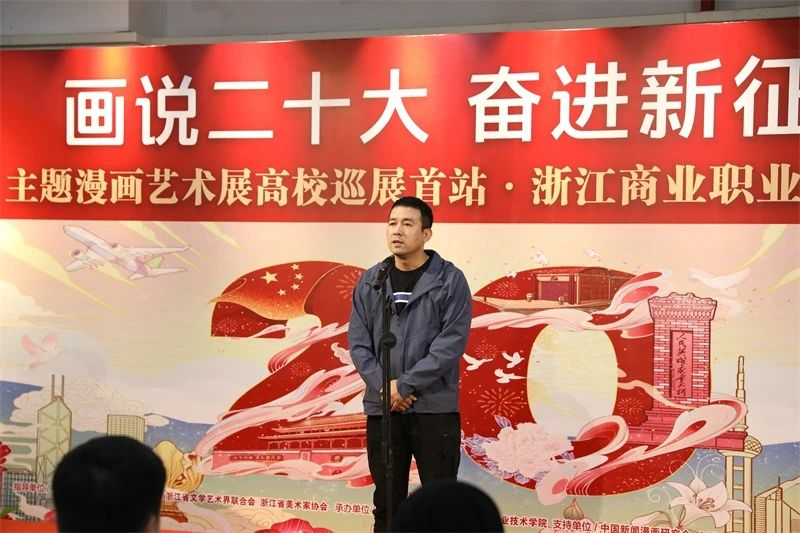 为了深入学习贯彻习近平新时代中国特色社会主义思想和党的二十大精神,增强大会精神宣传的生动性、影响力有效性,5月8日下午,“画说二十大 奋进新征程”主题漫画艺术展高校巡展首站在浙江商业职业技术学院艺术设计学院开幕。画展由浙江省委宣传部指导,浙江省文学艺术界联合会、浙江省美术家协会主办,省漫画家协会和我校承办。