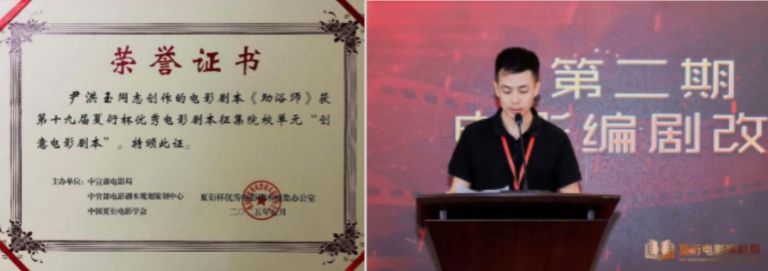荣获本届“夏衍杯”院校单元“创意电影剧本”的《助浴师》来自文学院戏剧影视文学专业校友、青年编剧尹洪玉,曾导演、编剧短片《彳 亍》获温哥华华语电影节、澳门国际电影节优秀奖;摄影作品入选平遥国际摄影大展等。《助浴师》讲述的是一个无证经营二人转小剧场兼唢呐手的东北小镇青年彻悟,阴差阳错成为助浴师。