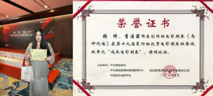5月21日,首届夏衍电影编剧周暨第十九届“夏衍杯”优秀电影剧本评选结果揭晓,我校文学院2024级编剧专业研究生张绮与华策电影学院2024级表演与导演专业(导演方向)研究生李洁霖联合创作的剧本《鸟神呢喃》获得院校单元赛道“成长电影剧本”奖并与浙江博采传媒有限签订意向协议。此外,文学院2016届戏剧影视文学专业校友尹洪玉的剧本《助浴师》荣获院校单元赛道“创意电影剧本”奖。