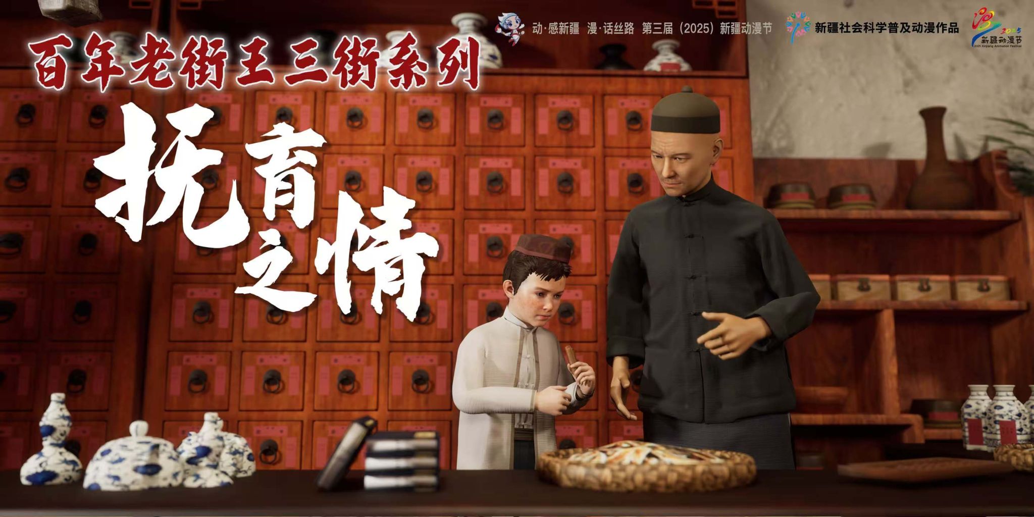 《百年老街王三街》以阿克苏王三街百年历史为背景,重点呈现天津商人王福才与维吾尔族青年肉孜的跨民族情谊,以及王三(玉山)悬壶济世、促进民族融合的生平事迹。通过动画叙事,展现新疆多民族共居、文化互鉴的历史脉络。