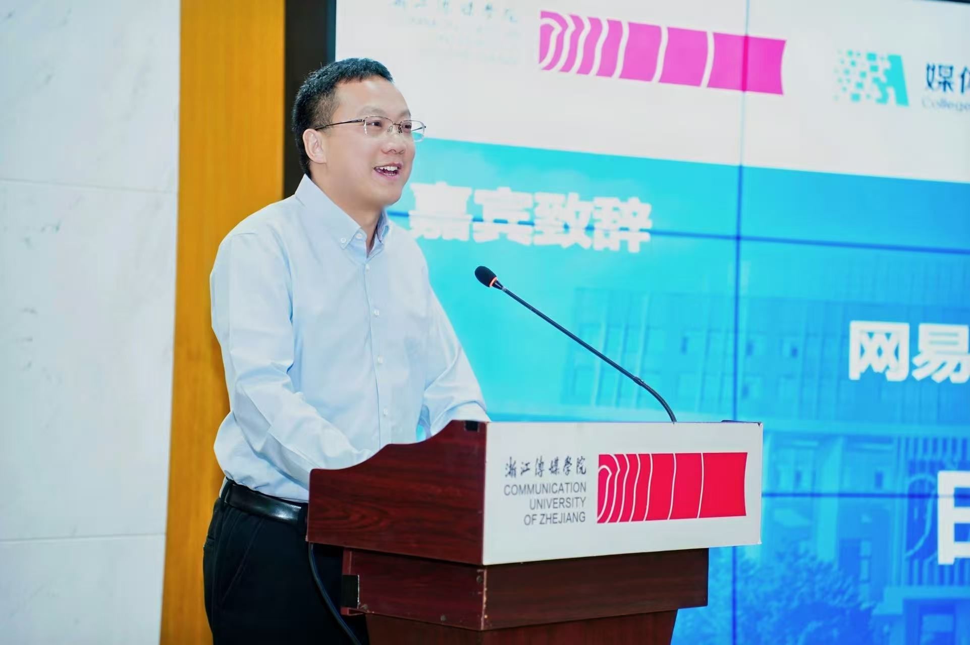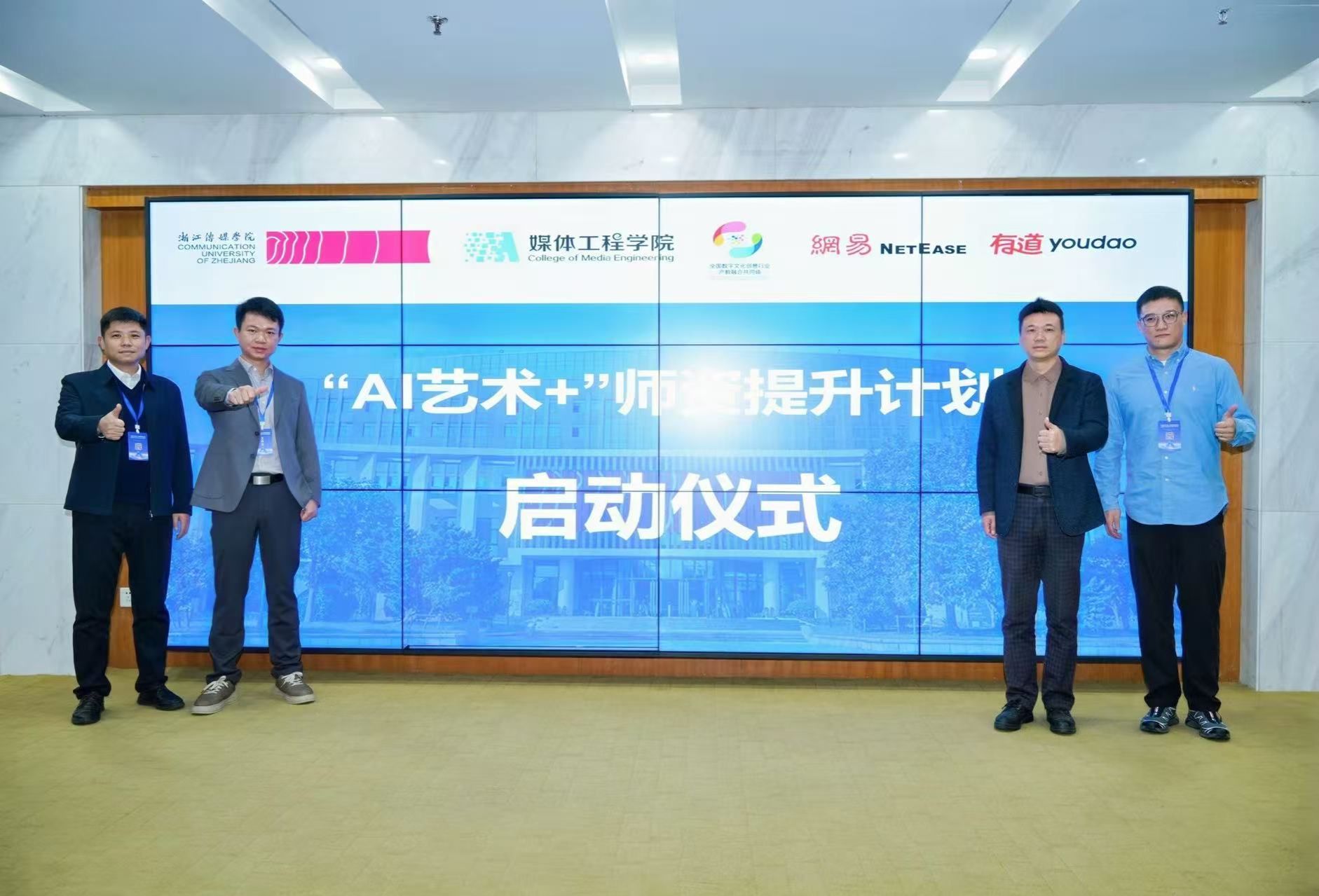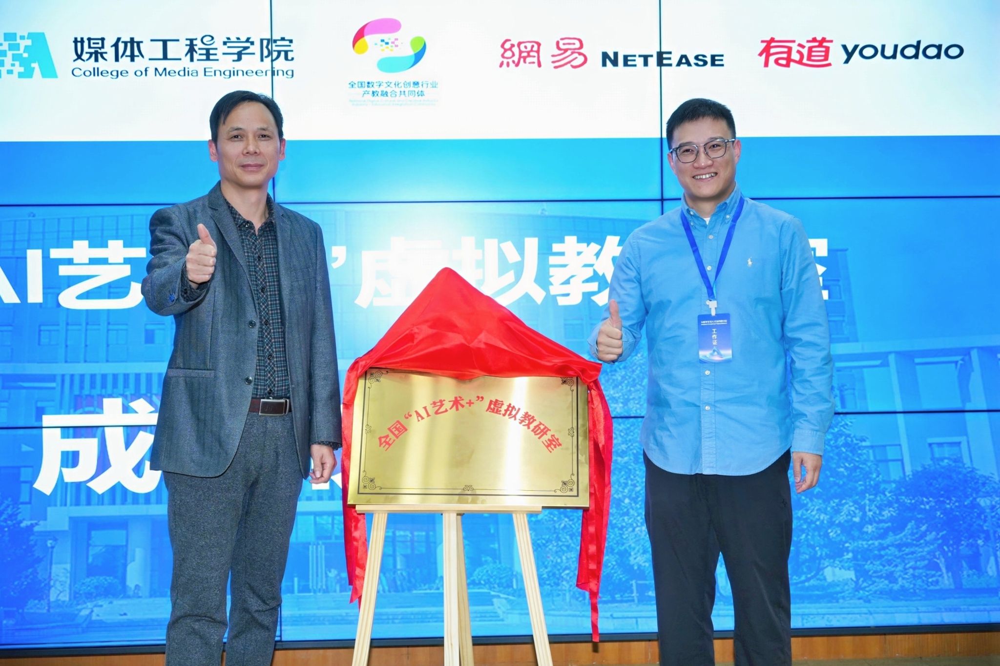 会议现场,我校教务处处长姚望和网易有道高教职教总经理宋维衍一起为全国“AI艺术+”虚拟教研室成立揭牌。