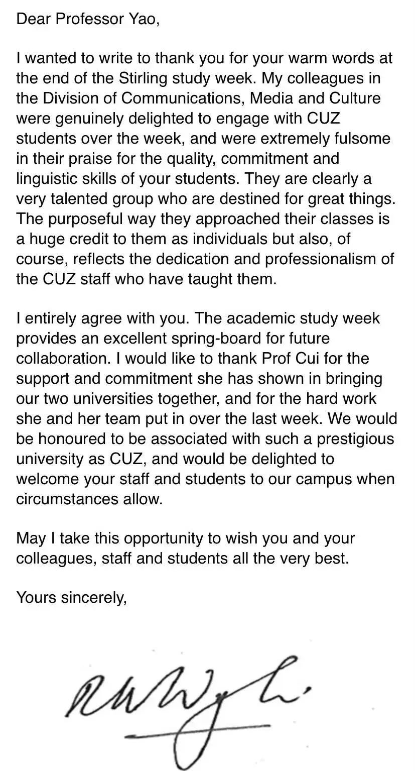 英国斯特灵大学学术周闭幕1小时后,姚争收到Neville Wylie的来信。信中,Neville Wylie称赞我校新闻与传播学院精心组织这场讲座,对我校与斯特灵大学的合作前景充满期待。