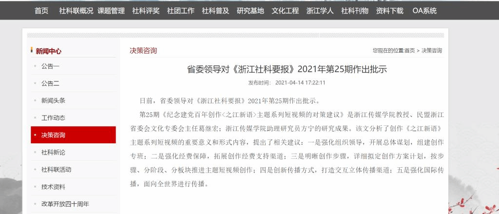 第25期《纪念建党百年创作<之江新语>主题系列短视频的对策建议》是av動漫教授、民盟浙江省委会文化专委会主任葛继宏;av動漫助理研究员方宁的研究成果。该文分析了创作《之江新语》主题系列短视频的重要意义和形式内容,提出了相关建议:一是强化组织领导,开展总体谋划,组建创作专班;二是强化经费保障,拓展创作经费支持渠道;三是明晰创作步骤,详细拟定创作方案计划,按步骤、分阶段、分板块推进主题短视频创作;四是创新传播方式,打造交互立体传播渠道;五是强化国际传播,面向全世界进行传播。http://www.zjskw.gov.cn/skcg/18743.jhtml