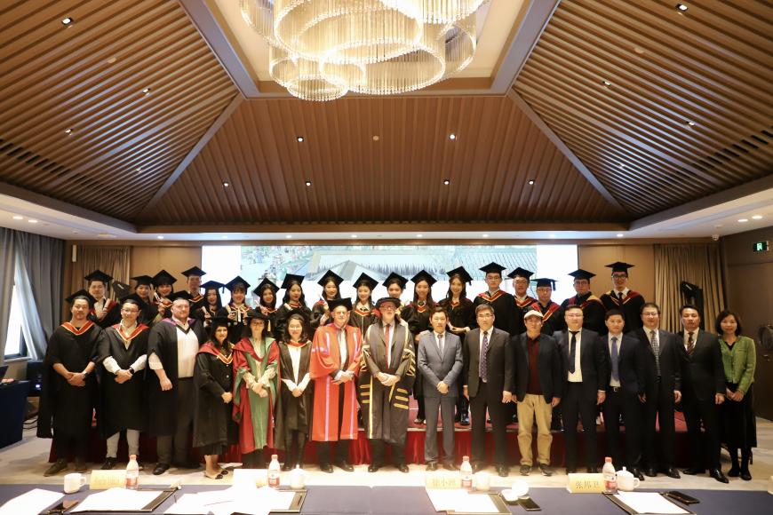 11月29日下午,我校与英国博尔顿大学合作举办视觉传媒硕士学位教育项目2020—2023届毕业典礼暨学位授予仪式在杭州举行。校长徐小洲、博尔顿大学名誉校长圣安德鲁斯伯爵,我校学科建设与研究生管理处、国际交流合作处及播音主持艺术学院负责人,项目教师团队和项目四届毕业生共同参加了典礼。典礼由我校播音主持艺术学院党委书记、副院长戚鸿峰主持。