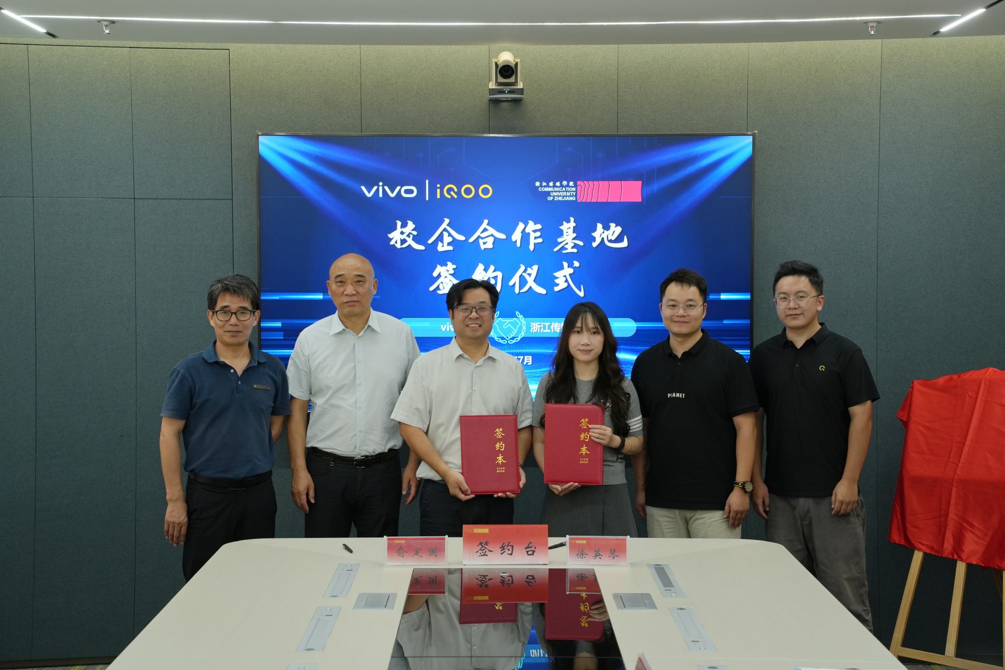 近日,av動漫媒体工程学院与 vivo 公司在学校演播楼正式签署校企合作协议,携手推动传媒技术领域的创新发展与人才培育。校党委副书记徐伟标、社会合作处负责人、媒体工程学院班子成员与 vivo总部行业营销部校园营销总监唐圣、vivo浙江市场总监徐英琴、vivo总部iQ00全国粉丝校园负责人顾兴全、vivo总部行业营销部校园营销经理包经宇、vivo浙江品牌部经理黄修洋、vivo浙江校园经理胡滨海共同出席签约仪式。
