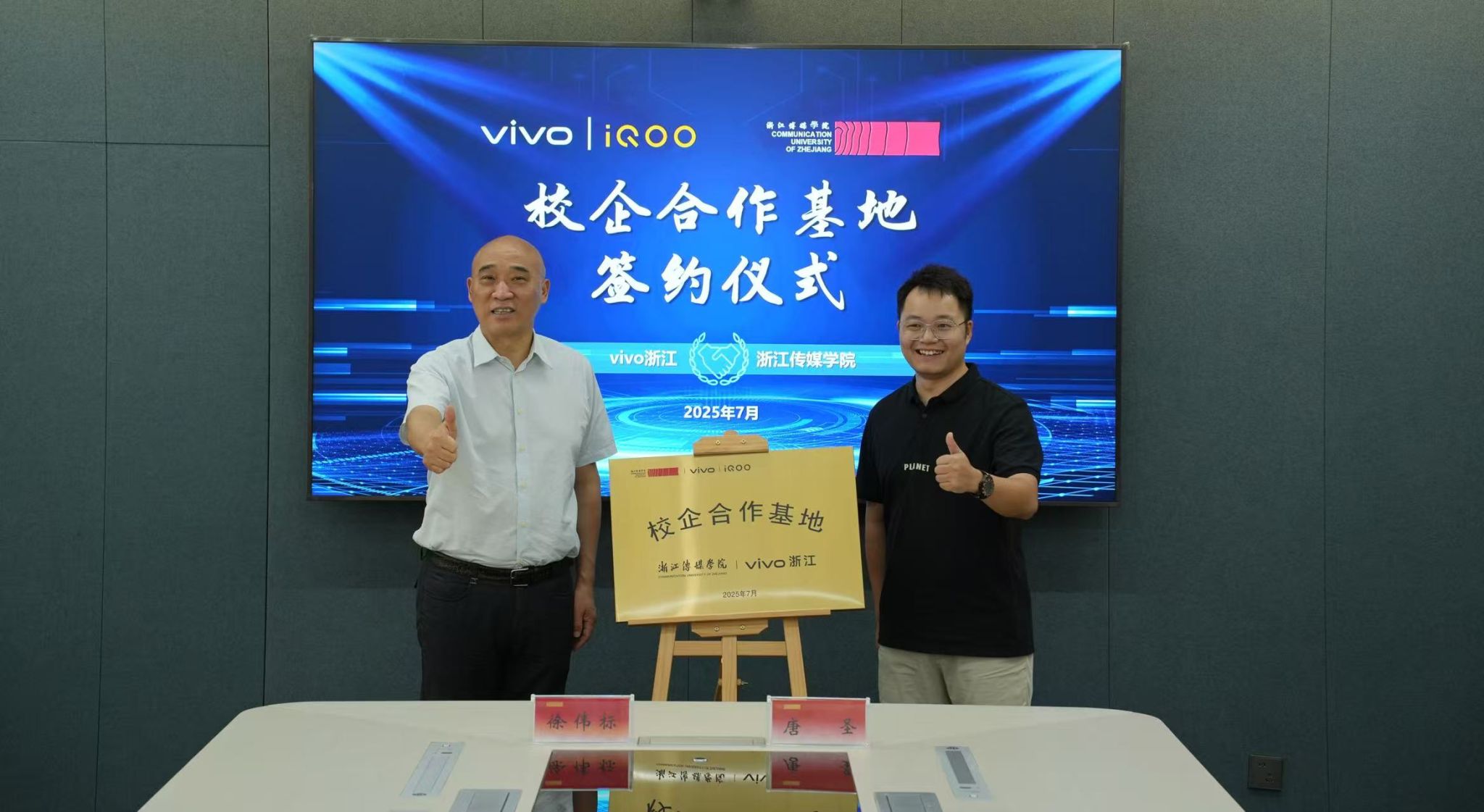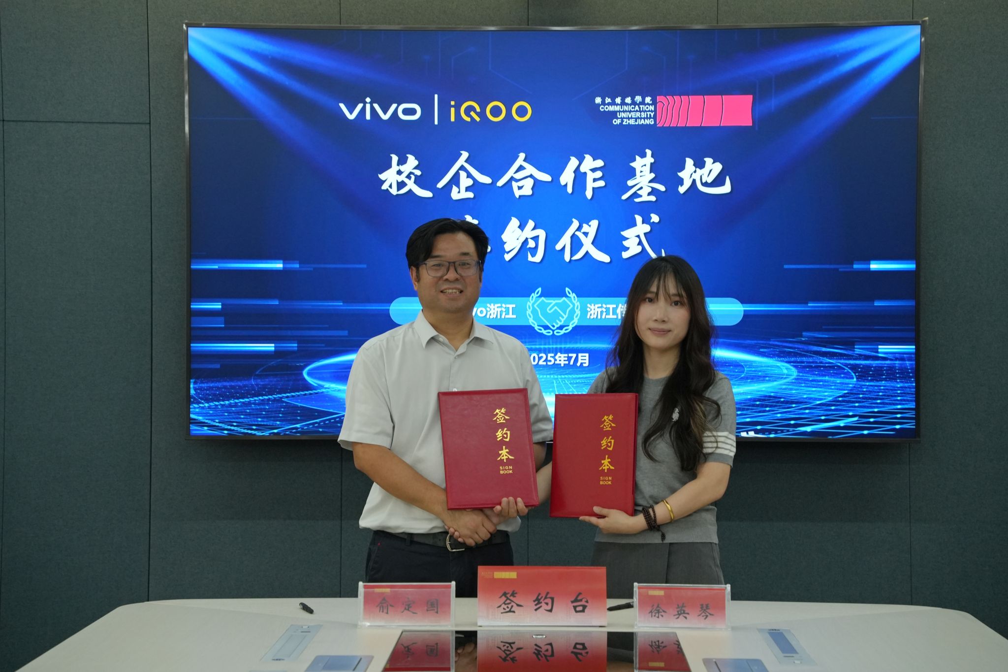 媒体工程学院院长俞定国与vivo浙江市场总监徐英琴共同签署合作框架协议。