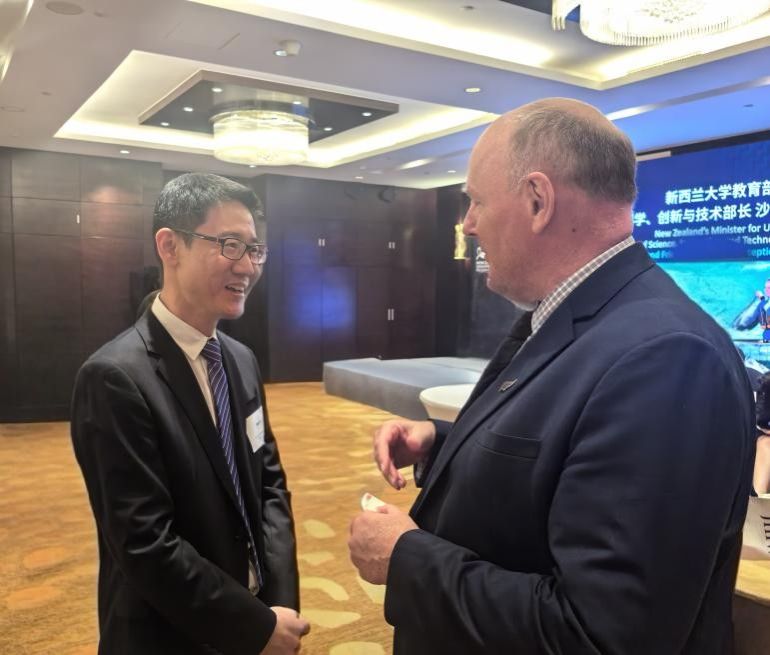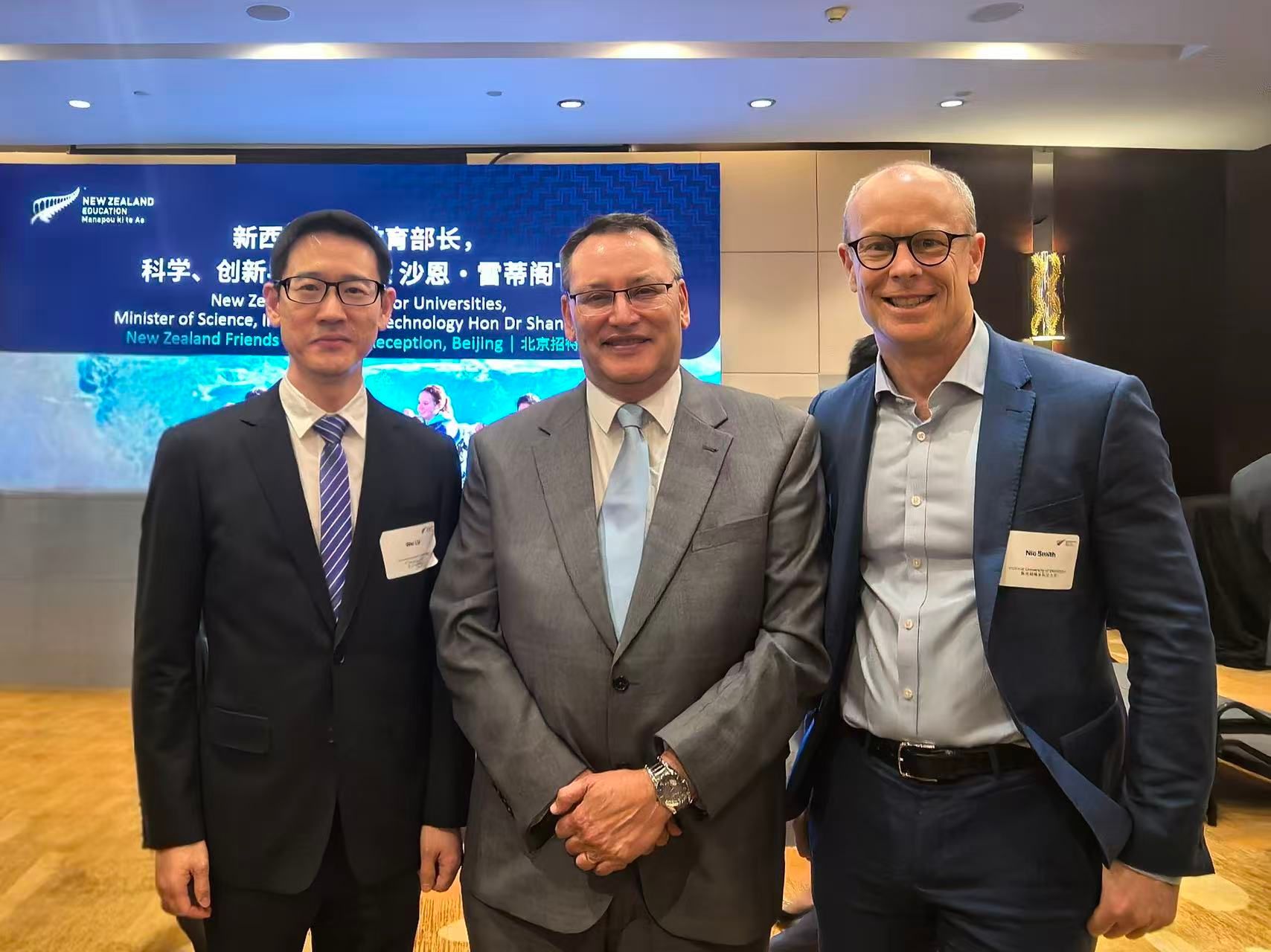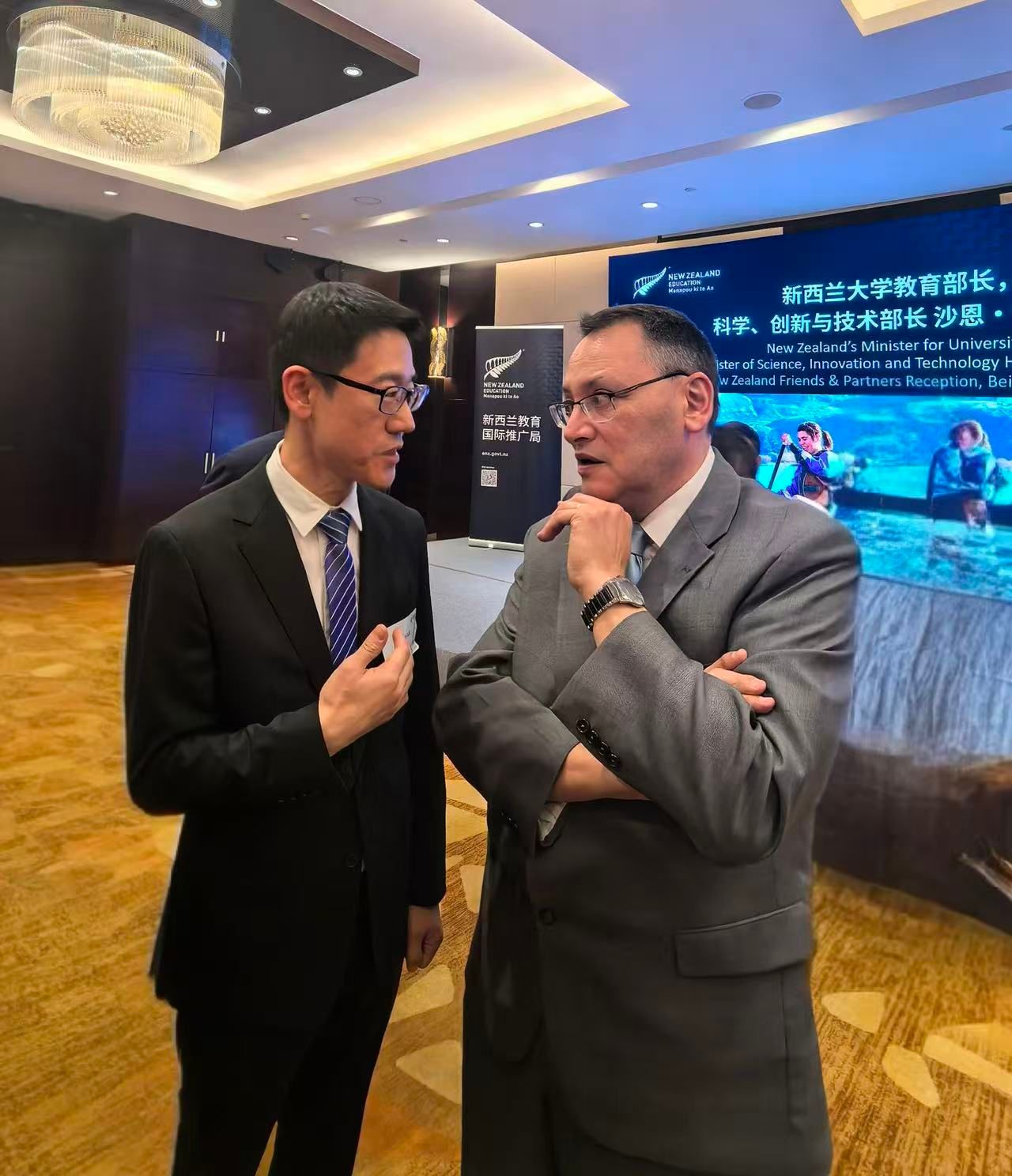 韦路受沙恩·雷蒂(Shane Reti)部长邀请,参加新西兰北京招待会,并与沙恩·雷蒂(Shane Reti)部长、新西兰驻华大使乔文博(Jonathan Austin)和惠灵顿维多利亚大学Nic Smith校长举行了富有成效的会谈,就共同筹建中外合作办学机构等事宜进行了深入探讨。双方一致同意,两校将依托各自学科优势,重点在艺术与科技等前沿交叉学科领域开展创新探索,旨在打破学科壁垒,共同构建引领未来的创新人才培养新模式,为全球智能媒体发展和文化产业变革培养创新型复合型人才。
