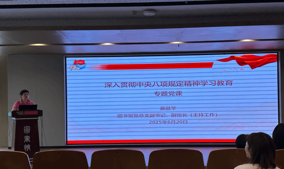 6月20日,图书馆党总支举办深入贯彻中央八项规定精神学习教育专题党课,党总支副书记、副馆长(主持工作)施益华作了题为《锲而不舍落实中央八项规定精神,以优良作风保障工作高质量发展》的专题授课,党总支全体党员参加会议。