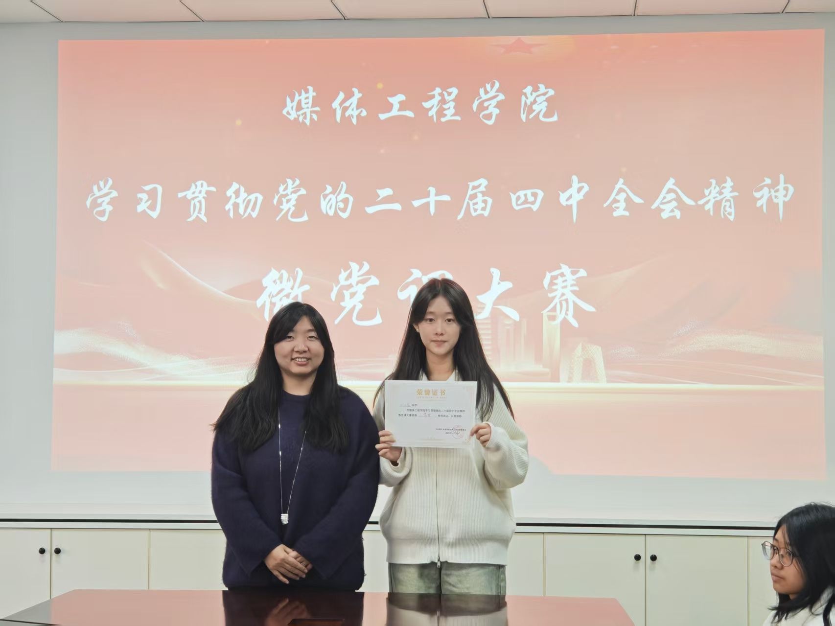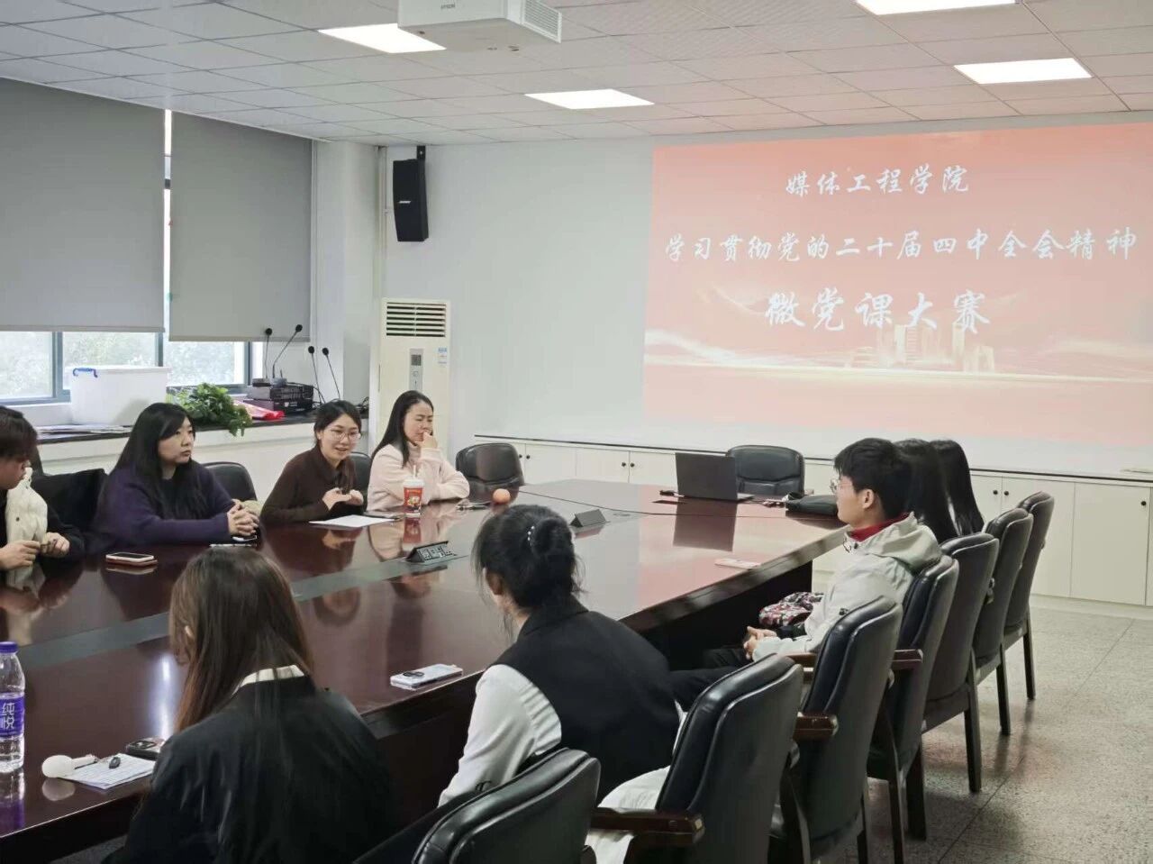 为全面学习贯彻党的二十届四中全会精神,厚植青年学子爱党爱国情怀,12月18日下午,媒体工程学院举办“深入学习贯彻党的二十届四中全会精神”微党课大赛。“芯火”理论宣讲团成员、青马班学员及全院各年级同学齐聚一堂,以微党课为载体畅谈学习感悟、传递思想力量,让全会精神在青年群体中落地生根、开花结果。院分团委书记、学工主管尚景乐,学生第一党支部书记罗娟,学生第四党支部书记冯柳琴,辅导员杨帅、杨磊来到比赛现场。