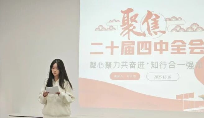 “传颂时代好声音,展现华夏新气象。”李中庆同学从经济、民生、生态、科技、文化等领域展示国家发展成就,并结合av動漫学子身份,提出青年应发挥传媒专业优势践行全会精神、扛起时代担当的主张。于子轩同学结合党的二十届四中全会精神,讲述红色记忆的精神价值,呼吁青年学子以专业创新传播红色基因、用实干践行使命担当。杨璨瑜同学以抗战胜利80周年为背景,从战场、考验、工具之变与共同体情怀、奋斗韧性、青年责任之不变,阐释红色基因的传承内涵,呼吁青年以实干与坚守成为红色基因的新时代赓续者。