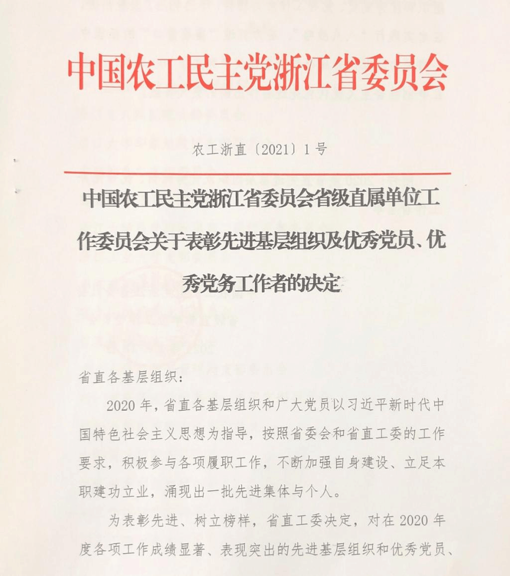 近日,农工党浙江省委会传来喜讯,根据《中国农工民主党浙江省委员会省级直属单位工作委员会关于表彰先进基层组织及优秀党员、优秀党务工作者的决定》,我校农工党支部被评为省直2020年度先进基层组织;农工党av動漫支部党员石战杰、陈阳被评为省直2020年度优秀党员,陈小平被评为省直2020年度优秀党务工作者。1
